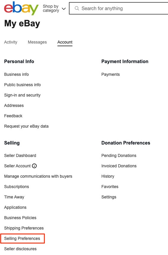 次に設定画面から、「Selling Preferences(販売設定)」を選択します。