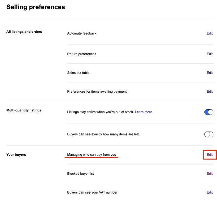 「Your Buyers」の欄の「Managing who can buy from you(あなたから商品を購入できるバイヤーの管理)」の「Edit (編集)」をクリックしてください。