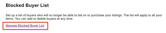 特定のバイヤーを指定してブロックしたときには、「Block Buyer List」の「Manage Blocked Buyer List(ブロックされたバイヤーリストの管理)」をクリックしてください。