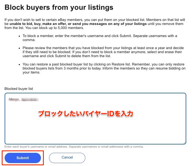 切り替わった画面で、ブロックしたいバイヤーのIDを入力して「Submit(申請)」ボタンをクリックするだけで設定完了です。複数のバイヤーを登録する場合には、バイヤーIDの間を、カンマ「,」で区切りましょう。