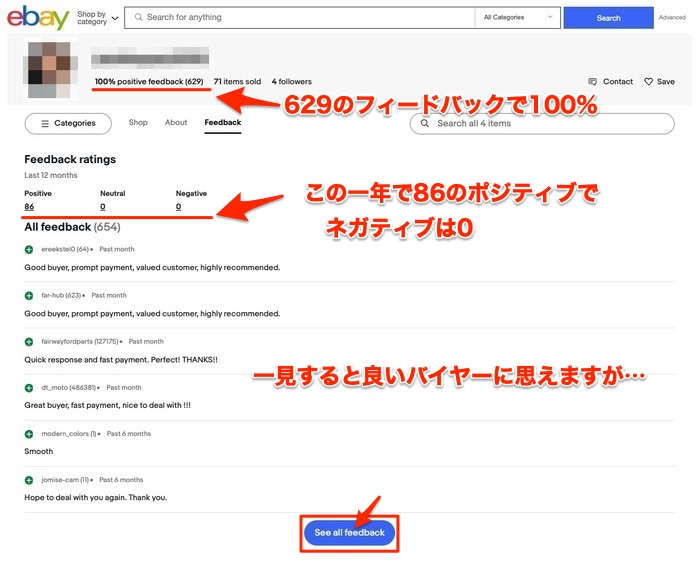 一見すると良いバイヤーに見えますよね。ですが、ここでもまだ安心はできません。さらに「See all feedback(すべてのフィードバックを見る)」をクリックしてください。