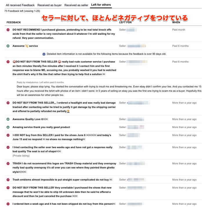 こちらのバイヤーからセラーへのフィードバックは、ほとんどネガティブをつけていることがわかります。