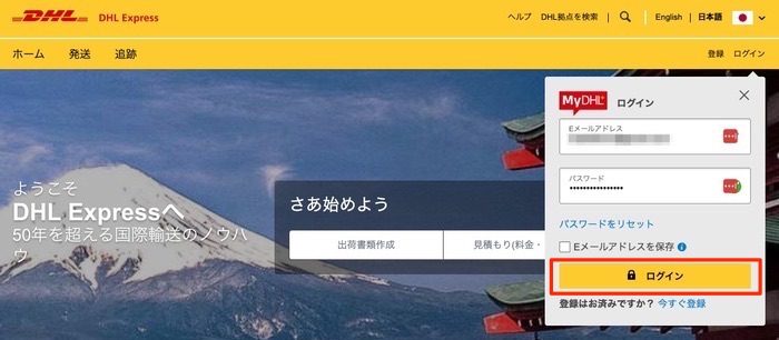 まずは、MyDHL+にログインします。右上のログインをクリックして、メールアドレスとパスワードを入力することで、ログインができます。