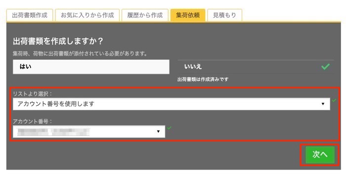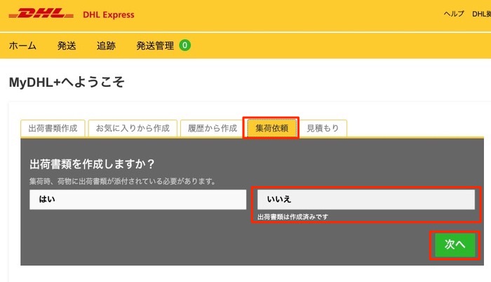 「集荷依頼」の画面から「いいえ」を選択後、「次へ」のボタンをクリックしてださい。