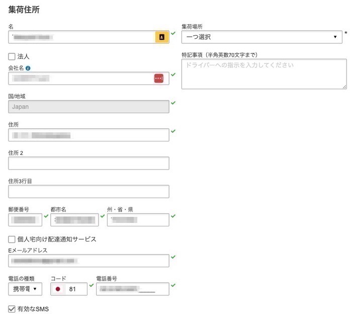 そうすると上記の画面に切り替わります。集荷の住所を入力していきます。
