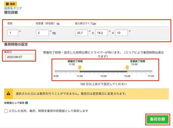 最後に、個数、総重量、最大梱包サイズ、集荷日、準備完了時間を入力します。