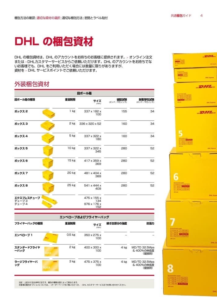DHLから提供してもらえる梱包資材には、下記のようなものがあります。