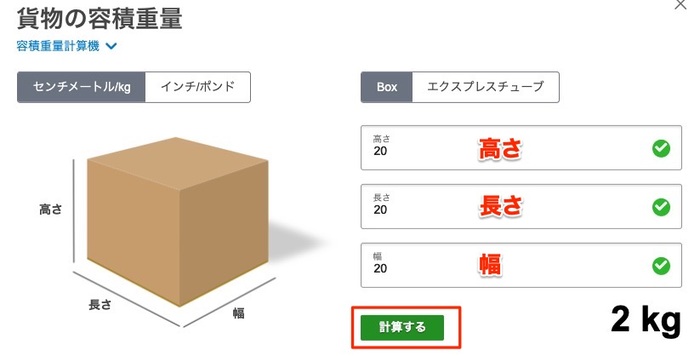3辺の長さを入力すれば、自動で容積重量を計算してくれます。