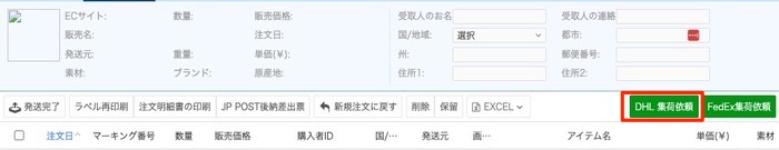 ラベル発行後に「DHL集荷依頼」をクリックします。