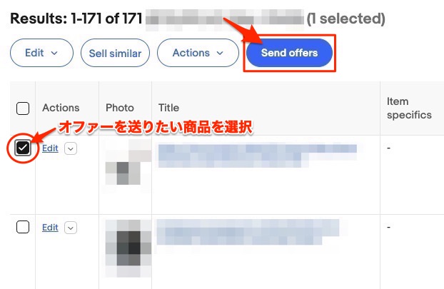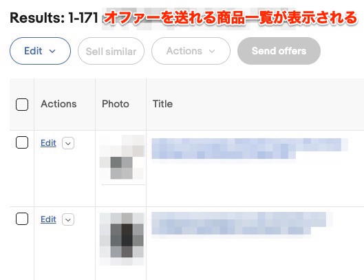 オファーを送りたい商品のリスト左部分のチェックボックスにチェックを入れてから、上の「Send offers」ボタンをクリックしてください。