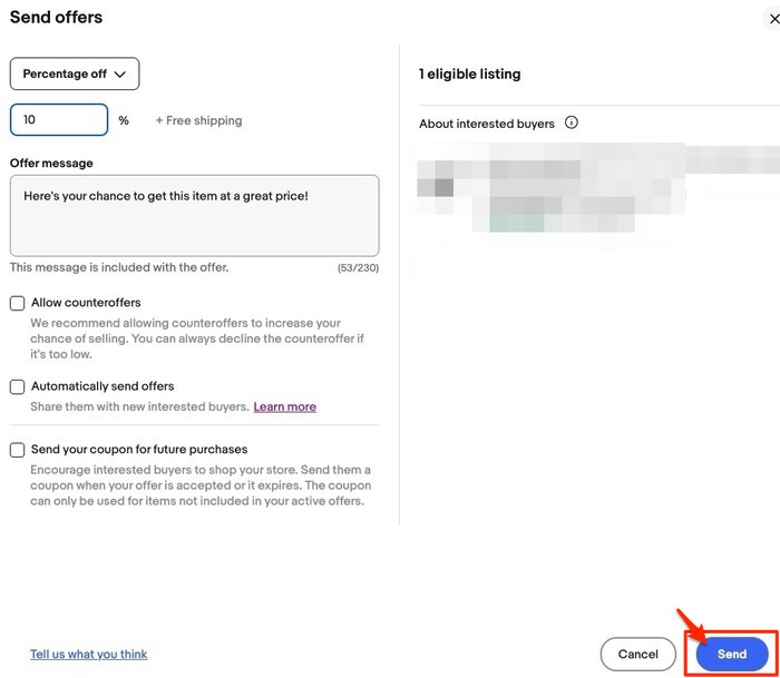 - Automatically send offers:バイヤーが商品にWatchをつけたりカートに追加したりしたときに、自動で送る機能
