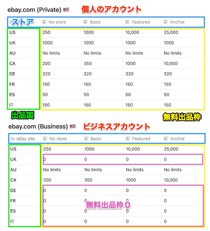 特にビジネスアカウントの場合は、イギリス、ドイツ、イタリア、フランス、スペインへの出品は無料出品枠が0となっているので注意が必要です。