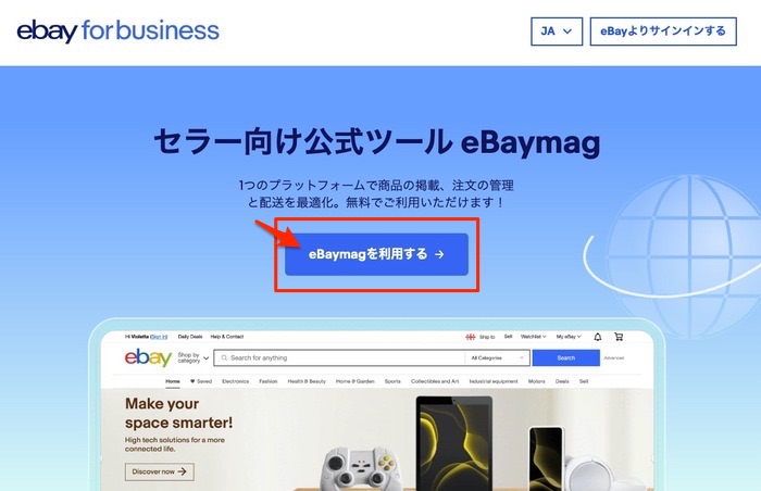 画面中央にある「eBaymagを利用する」と書かれた青ボタンをクリックしてください。