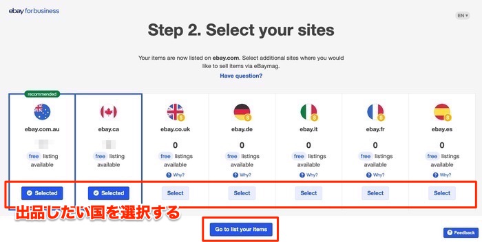 それぞれの「Select(選択)」ボタンをクリックしたら、「Go to list your items(商品リスト作成へ)」ボタンで次の画面へ進みます。