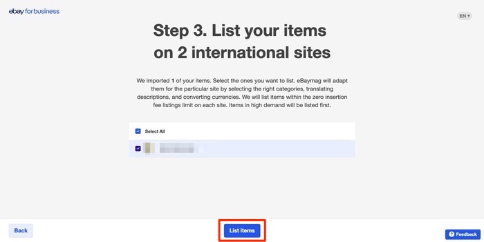 「Select All(全て選択)」にチェックを入れれば、全ての商品を出品することができます。