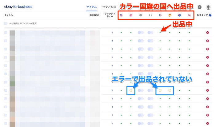 そして、きちんと出品されていれば国旗下のリストに緑色の点が表示されます。「!」マークがついていた場合は、エラーで出品できていないお知らせです。カテゴリーのミスマッチや無料出品枠を超えていることが考えられます。「!」マークをクリックすることで修正が可能です。