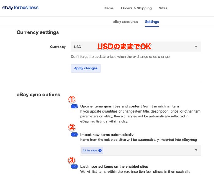 - Update items quantities and content from the original item(元の商品から商品の数量と内容を更新):ONにしておきましょう。 USアカウントで商品の情報を変更したときに、1日以内でeBaymagにも自動で反映されます。