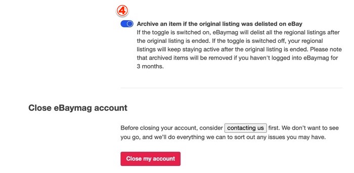 - Archive an item if the original listing was delisted on eBay(元の出品が出品解除された場合、他国サイトの商品出品も終了する):トラブルを避けるためにONにしておくのがおすすめです。