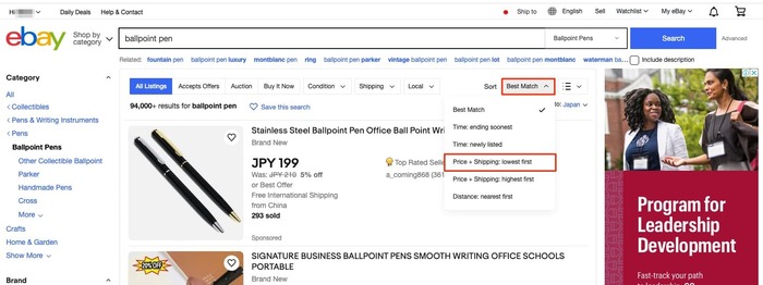 検索結果が表示されたら、右の方にあるsort 「Best Match」から「Price + Shipping:lowest first」を選択すると、価格と送料を合わせた安いもの順に表示されます。