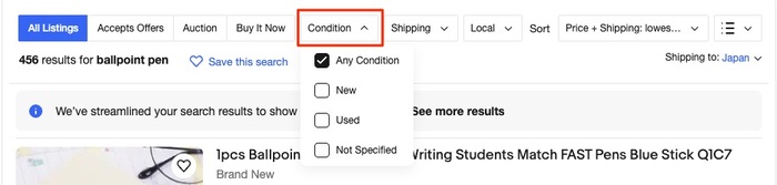 新品や中古品を選択したい場合には「Condition」から「New」や「Used」を選択してください。