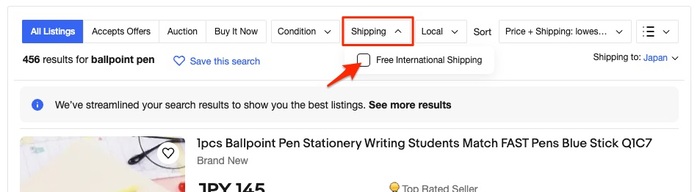 最初は送料無料の商品がおすすめですので、「Shipping」から「Free international Shipping」にチェックしてください