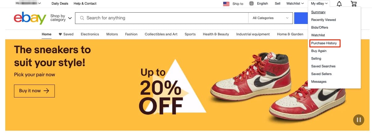 右上の「My ebay」から「Purchase history」(購入履歴)を選択します。