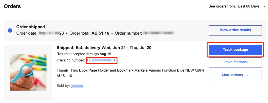 購入した商品が発送されると追跡番号(tracking number)がアップされます。