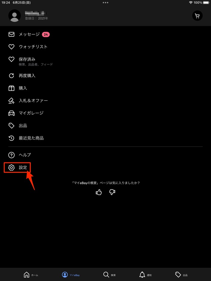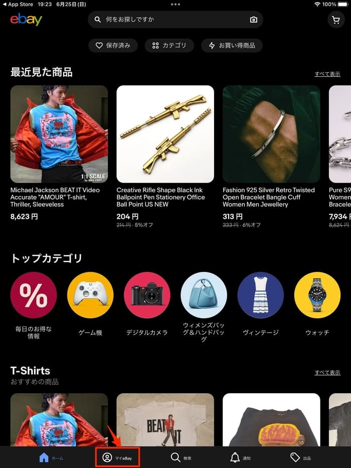 ホーム画面の下部にある、「マイebay」をクリックします。