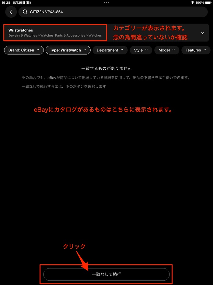検索結果の枠の上にカテゴリーが表示されるため、情報が間違っていないか確認してください。今回はebayにカタログがないため、「一致なしで続行」をクリックします。