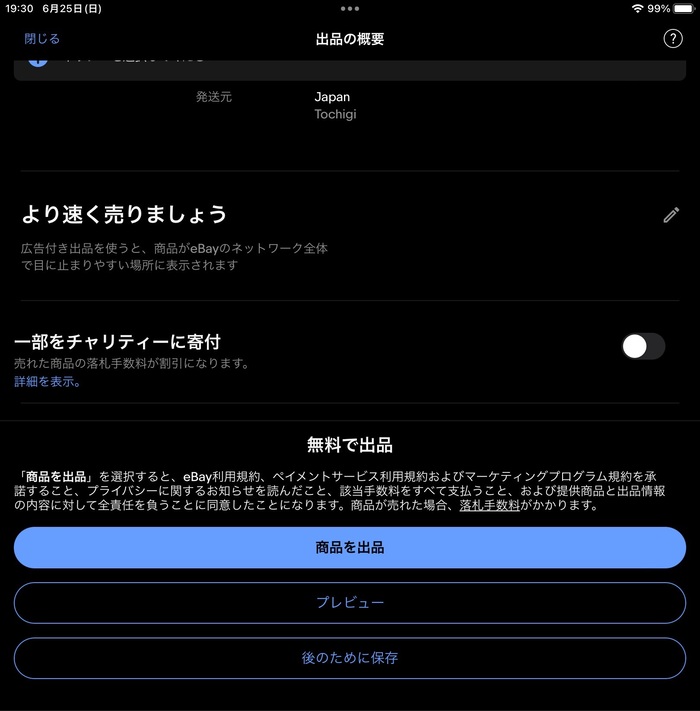 全て設定し終わったら、「商品を出品」をクリックします。