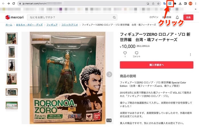 まずは、メルカリやヤフオクの出品画面を開いてください。そして、画面右上のImage Downloaderの矢印マークをクリックします。