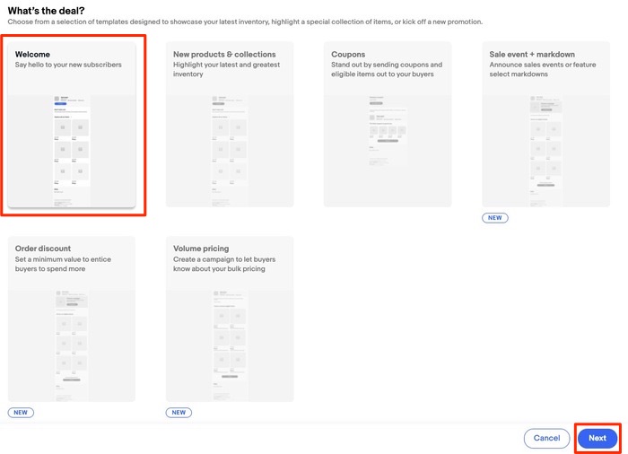 左上にある「Welcome」のテンプレートを選択し、右下の「Next」ボタンをクリックしてください。