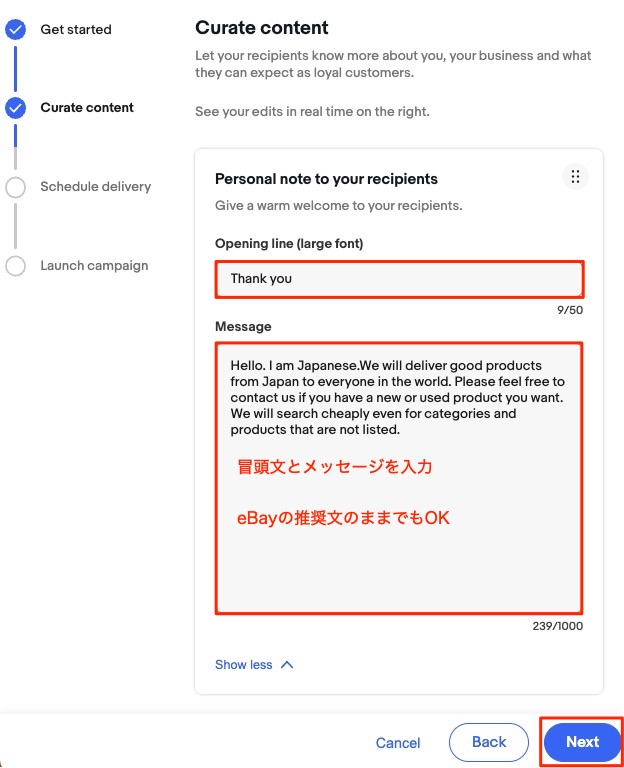 次の画面で、実際にバイヤーに届けたいメッセージを入力します。最初にeBayの推奨文が既に入力してありますので、そのまま使用しても大丈夫です。