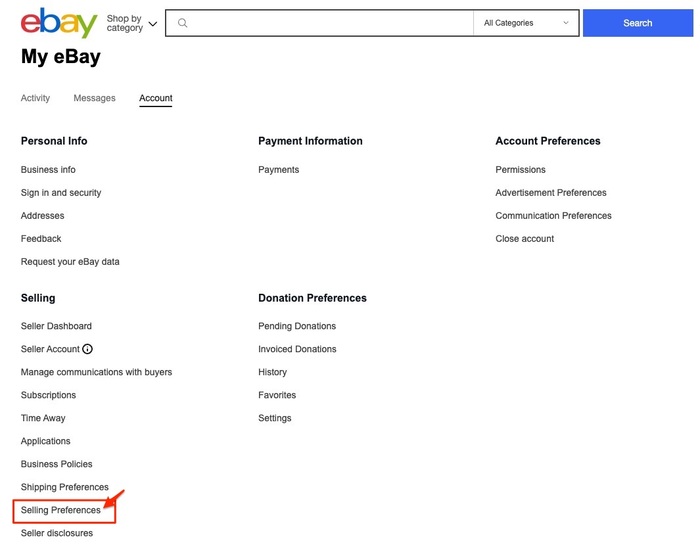 ページが切り替わったら、左側のバーの「Selling」から「Selling Preferences」を選択します。