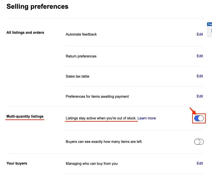 Selling Preferencesのページの、「Multi-quantity listings」の上部分「Listings stay active chen you’re out of stock.」の設定をオンにします。