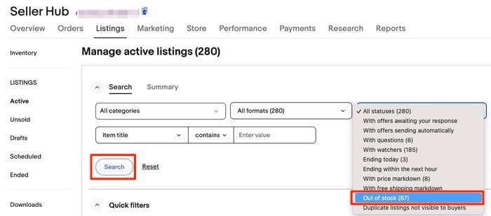 Listings画面で、在庫切れの商品のみを検索して表示させることができます。