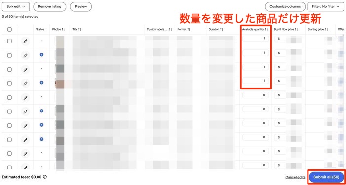 確認して、「Submit all」ボタンをクリックすれば、在庫数の更新完了です。