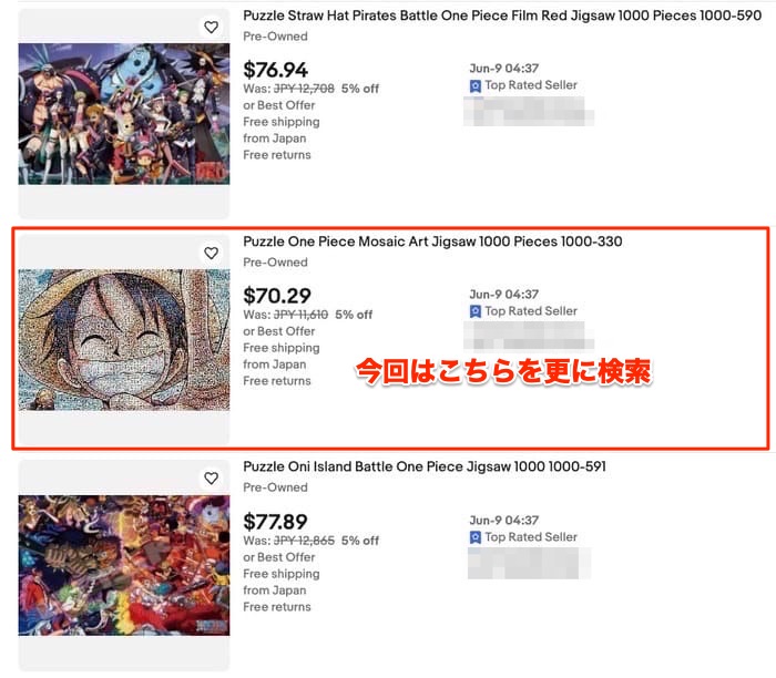 今回は例として、ワンピースのジグソーパズルを検索してみます。